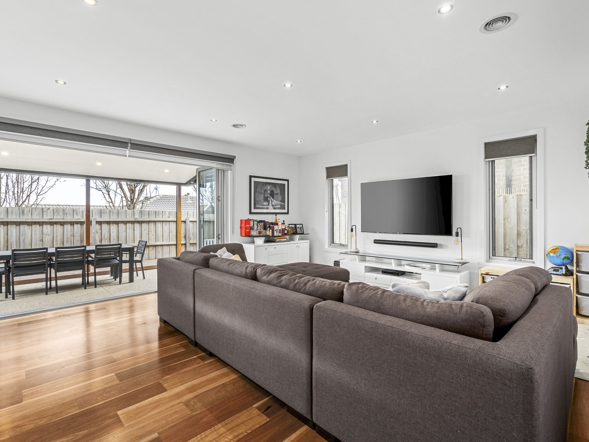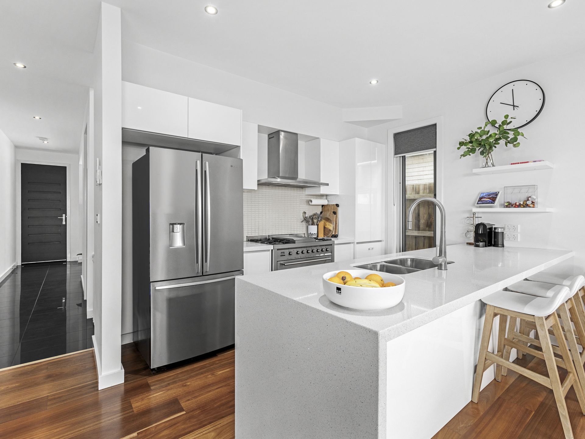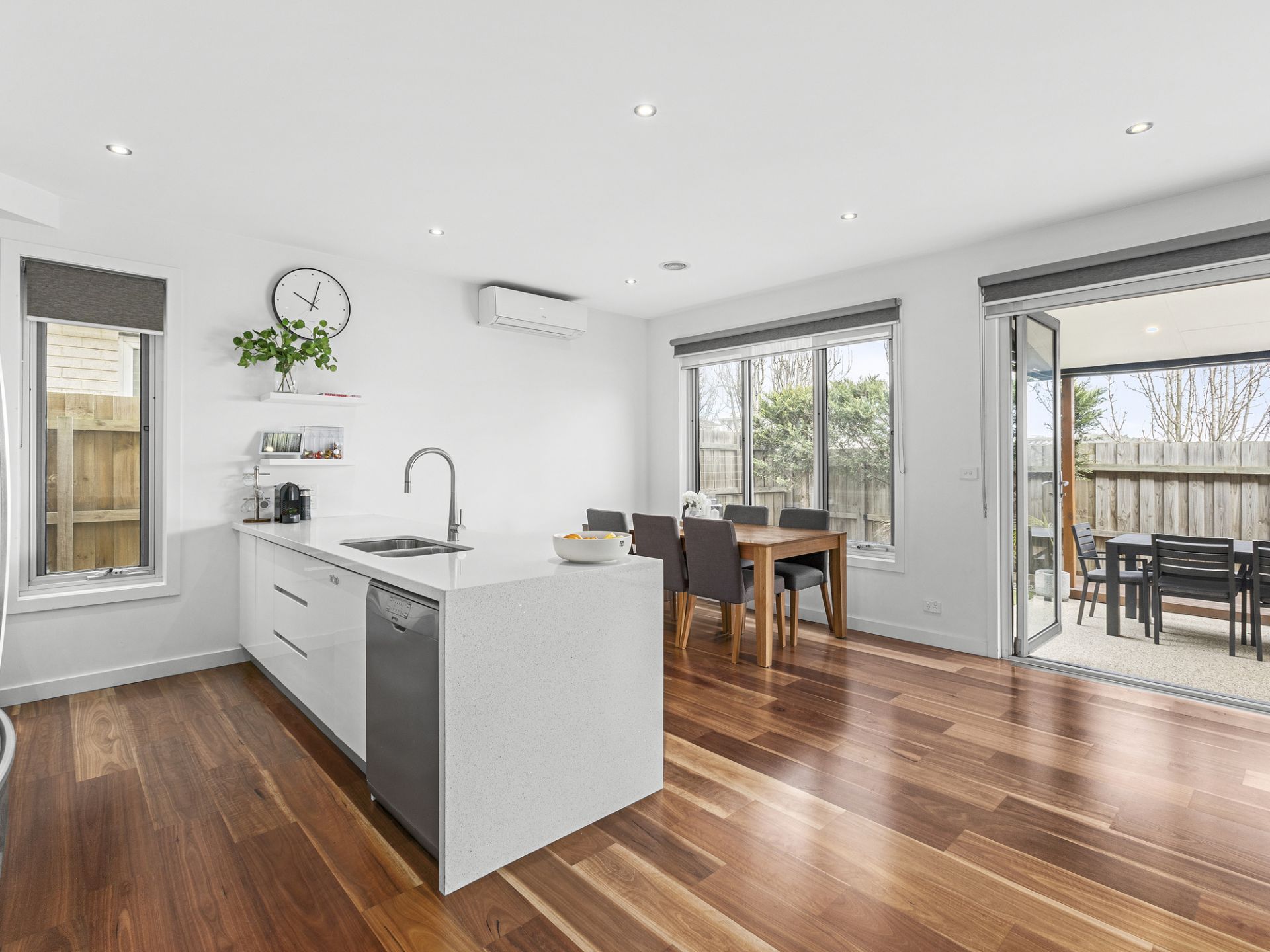 Step inside to find soaring ceilings, rich timber floors, and a flowing open-plan layout that leads to a sun-soaked west-facing alfresco – the perfect spot for entertaining or enjoying golden afternoon light. Bifold doors create seamless indoor-outdoor living, while the stunning kitchen impresses with stone benchtops, waterfall ends, stainless steel appliances and quality cabinetry.